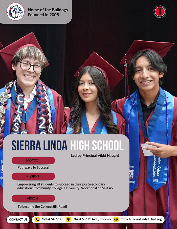 Welcome to Sierra Linda High School! We serve nearly 2,000 students in grades 9–12 in the Tolleson Union School District. Our school, located in the friendly, family-oriented city of Tolleson, enjoys plenty of support from our community.